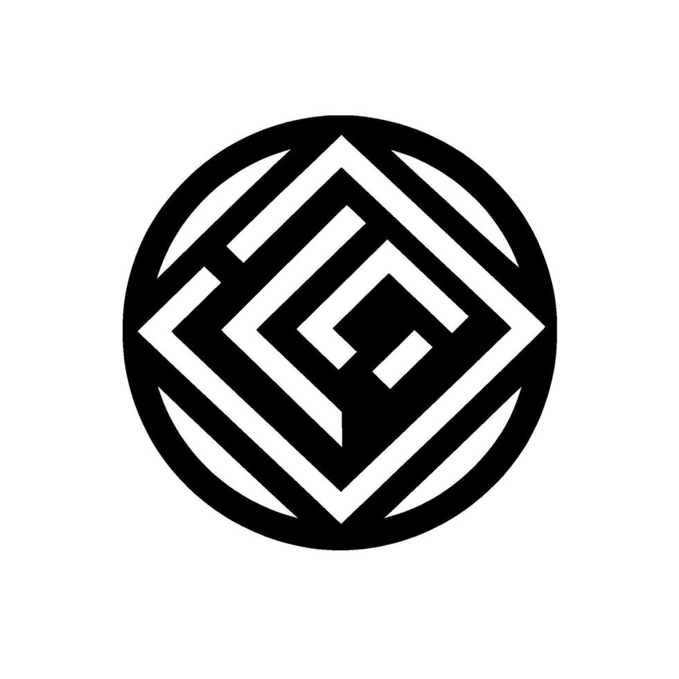 Geometric, abstract, black and white featuring a square within a circle, creating a labyrinthine pattern. vector