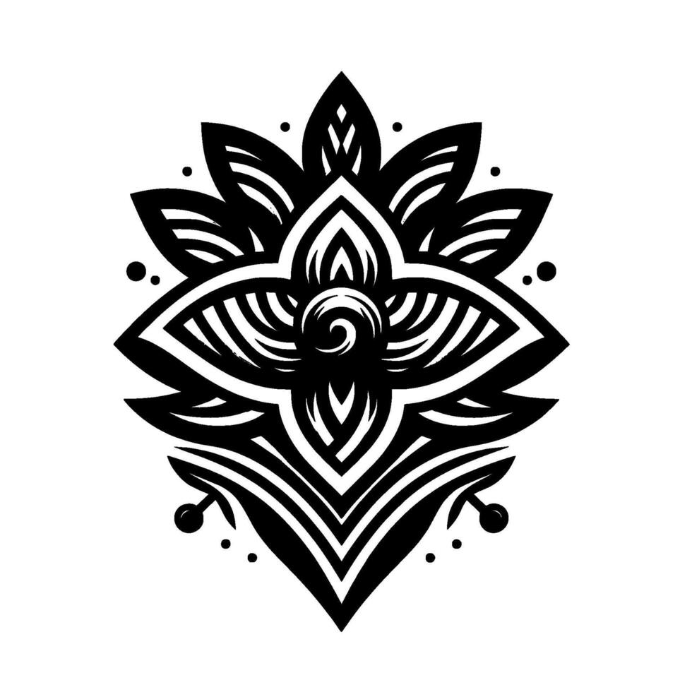 Intricate black and white floral mandala with layered petals, geometric patterns, and stylized leaf elements, centered on a white background. vector