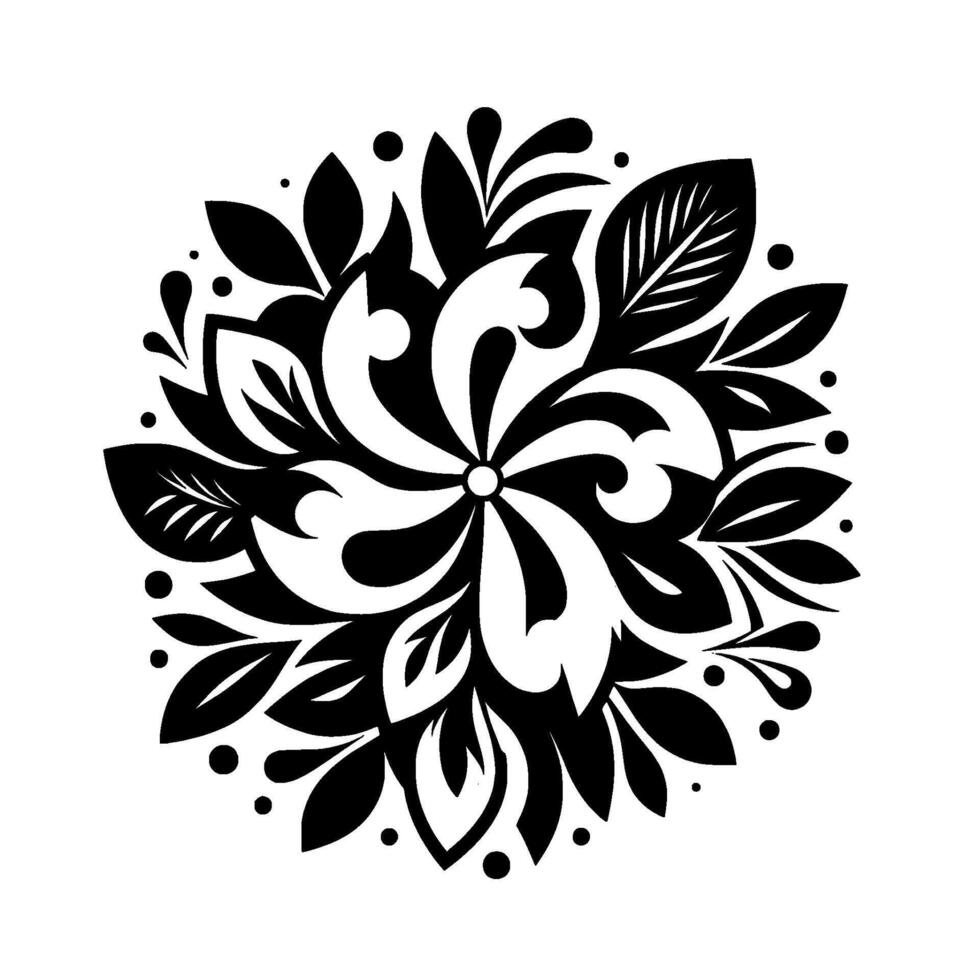 Symmetrical Black and White Floral Mandala with intricate leaf and petal patterns, creating a harmonious, stylized on a stark white background. vector
