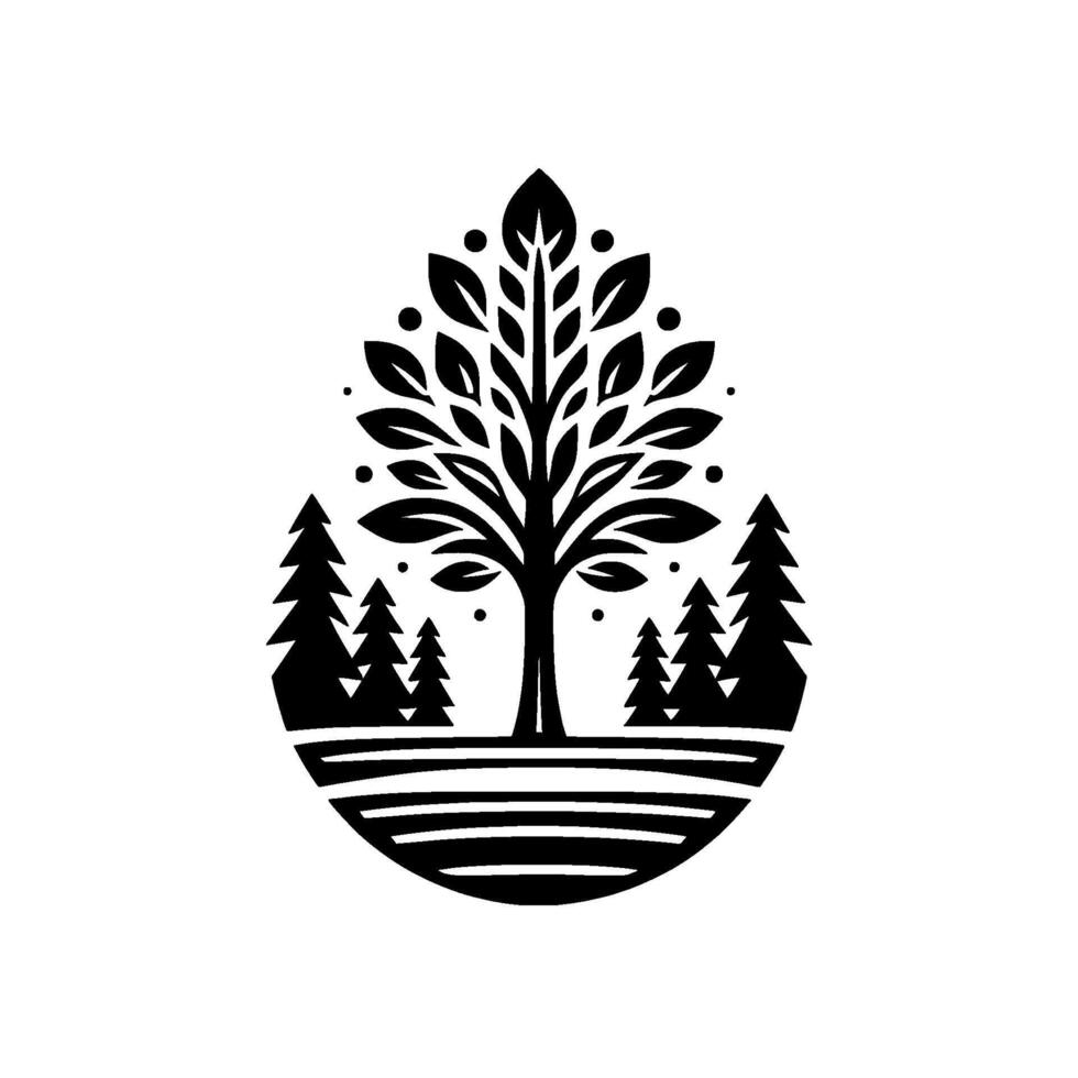 A stylized, symmetrical black and white depicts a central, leafy tree enclosed within a teardrop shape, framed by pine trees atop a striped base. vector