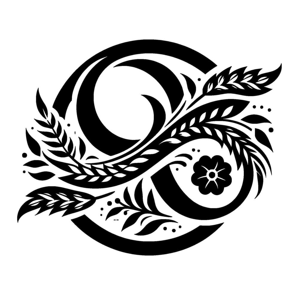 Decorative Monochromatic Floral with Circular Frame and Intricate Leafy Branches, a Flower, and Polka Dots. Free Vector