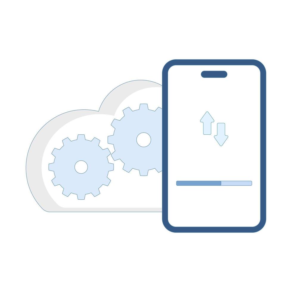 cloud computing concept, data transfer, software update and mobile device setup. cloud with smartphone hardware and screen. restoring or syncing apps on new device. flat design illustration. Pro Vector