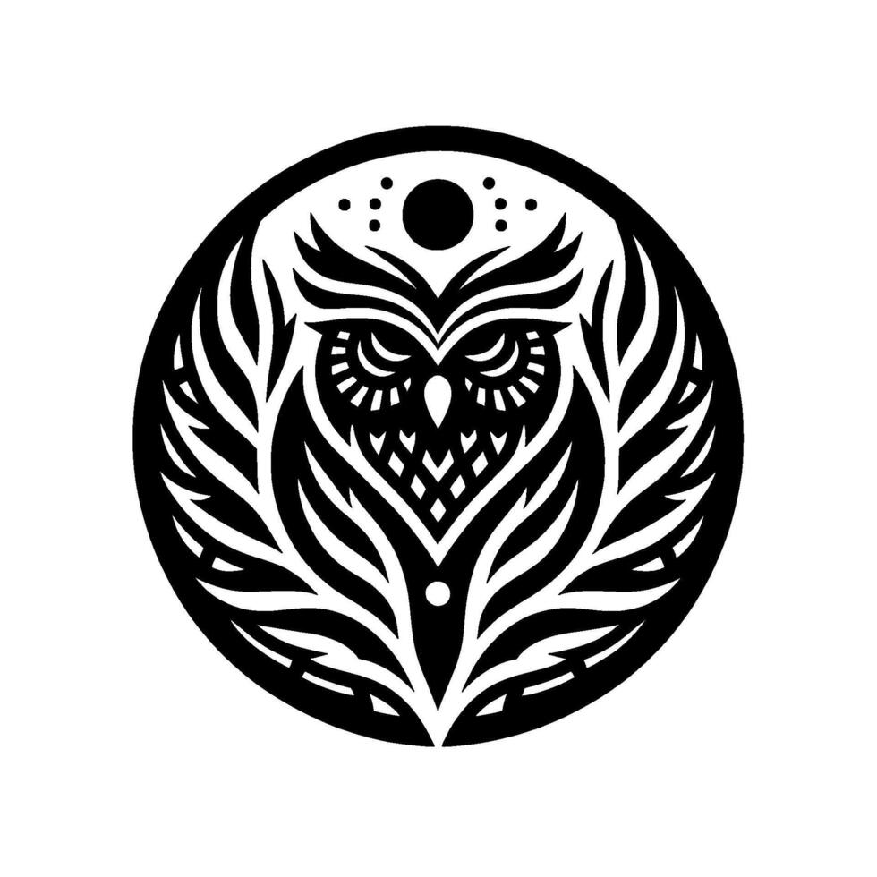 Intricate Black and White Owl Motif within a Circular Frame, Featuring Detailed Feather Patterns and Staring Eyes. vector