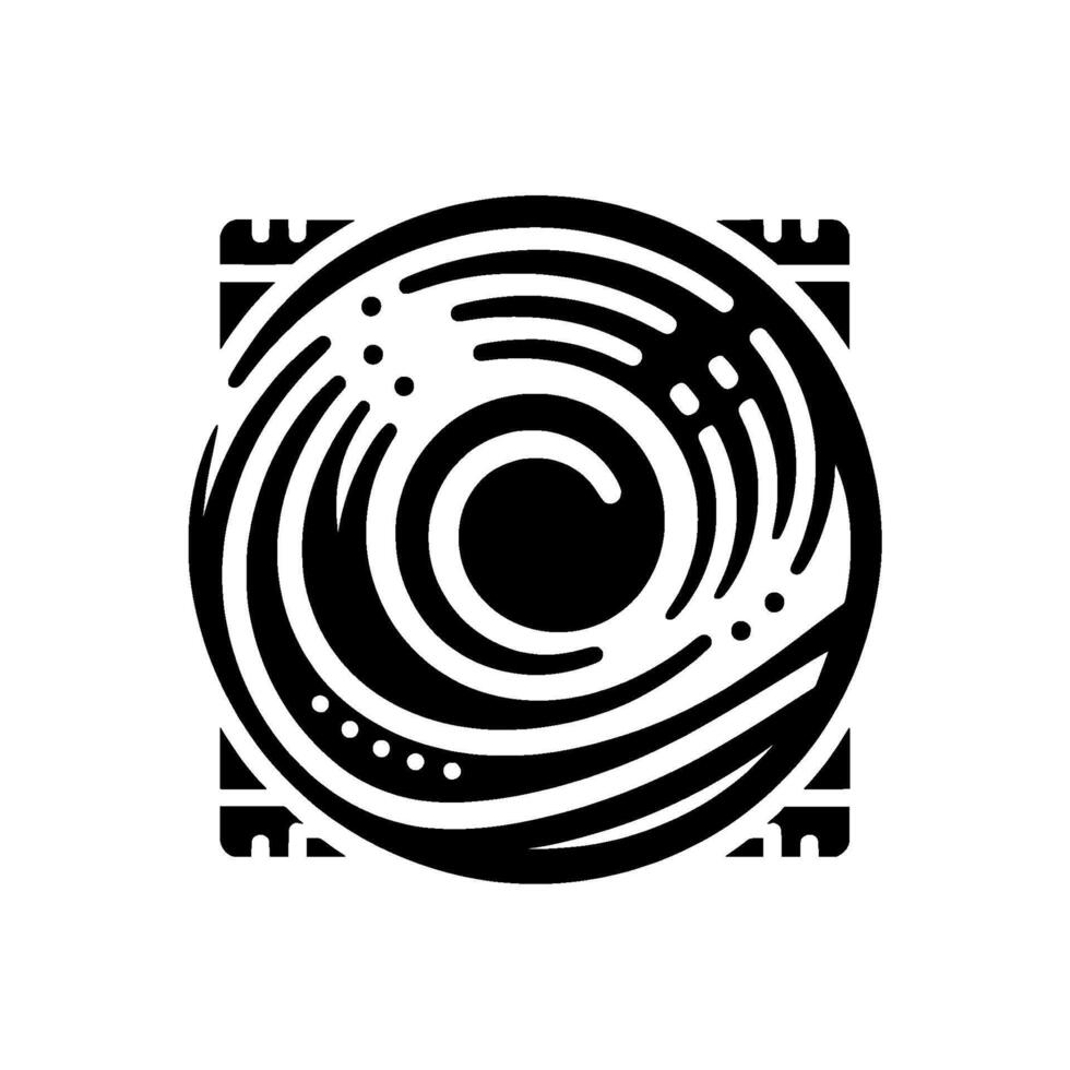 A minimalist black and white graphic, featuring a stylized swirling vortex within a square frame, accented with dots and simple lines, evokes movement. vector