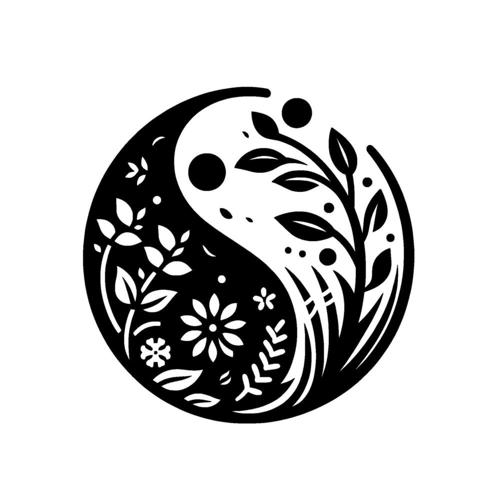 Yin Yang symbol reimagined A balanced interplay of nature, with floral elements and botanical forms elegantly arranged within the iconic shape in contrasting black and white tones. vector