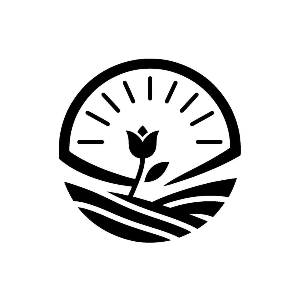 A minimalist featuring a tulip blossoming beneath an arched sun, set over stylized rolling fields within a circular frame. vector