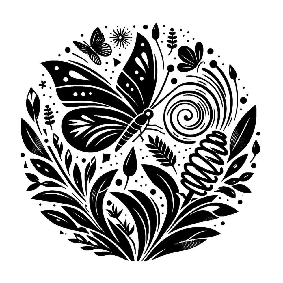 Circular, black and white illustration of a butterfly and flora, with intricate patterns, dots and swirls creating a harmonious design. vector