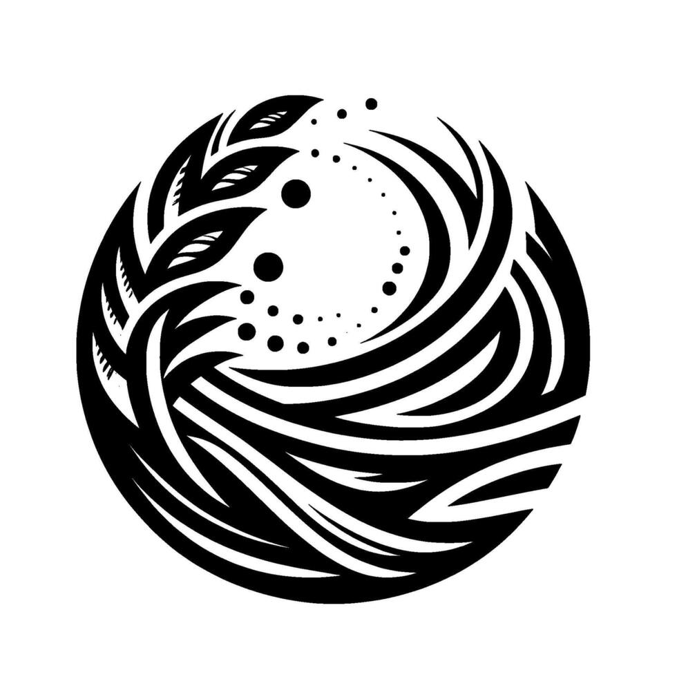 Intricate black and white circular design, featuring stylized leaves, fluid lines, and dot patterns within a sphere on a clean white background. vector