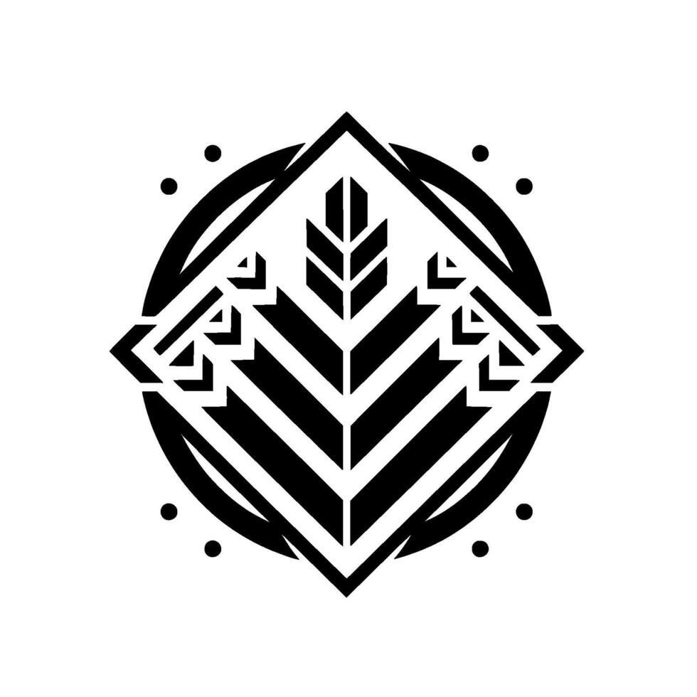 Abstract geometric emblem of stylized wheat with symmetrical, angular details within a circle and diamond frame. vector