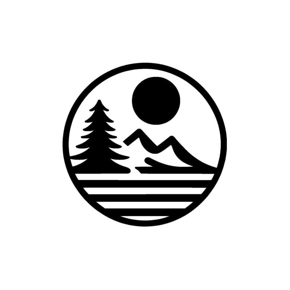 Monochromatic circular featuring a stylized mountain range, pine tree, sun, and striped waterhorizon line, all within a black border on a white background. Pro Vector