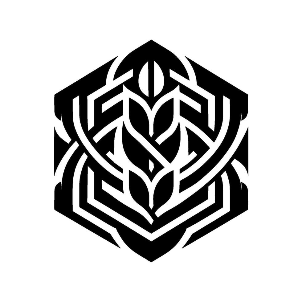Black and White Geometric Design Hexagonal Shape with Abstract Wheatlike Pattern and Intricate Line Work on White Backdrop. Pro Vector
