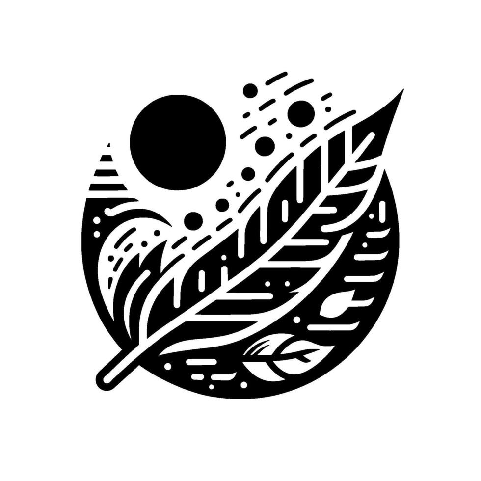 Monochromatic Geometric Featuring a Stylized Feather, Celestial Sphere, and Abstract Decorative Elements, Enclosed Within a Circular Frame. Pro Vector