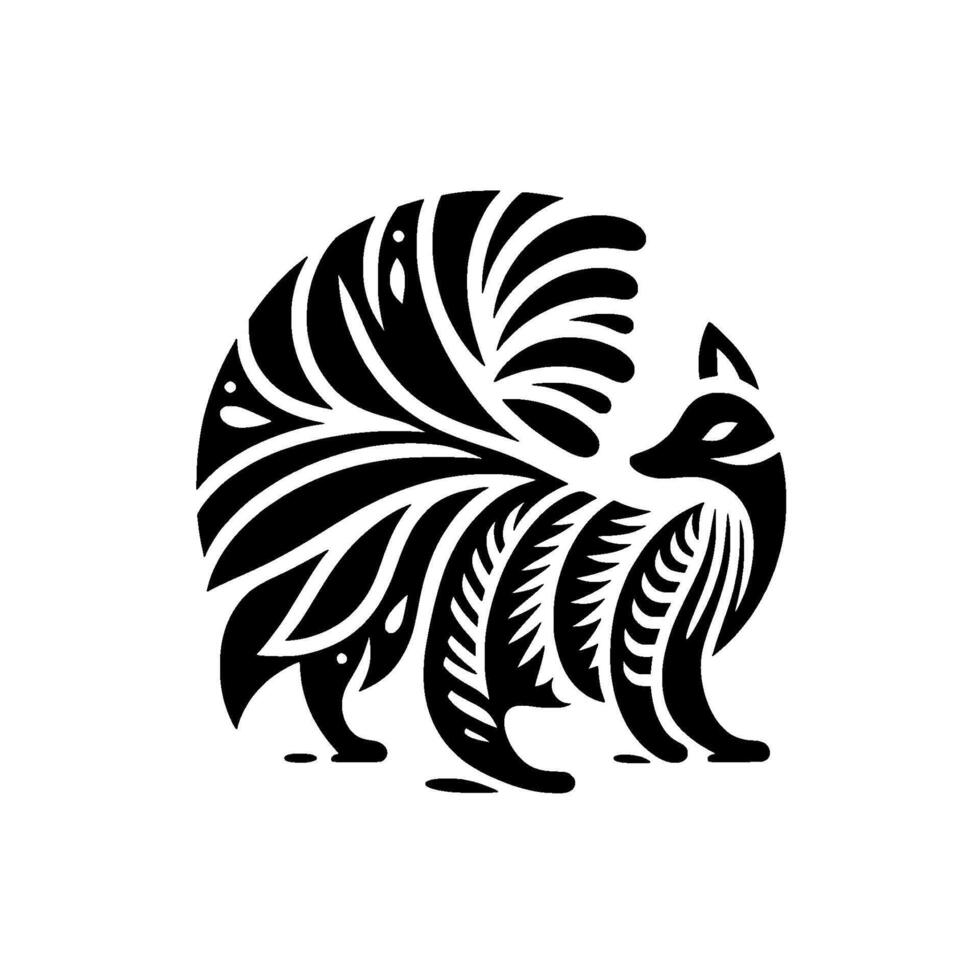 A stylized black and white fox illustration, featuring intricate patterns within its body and a large, decorative tail, set against a clean white background. Pro Vector