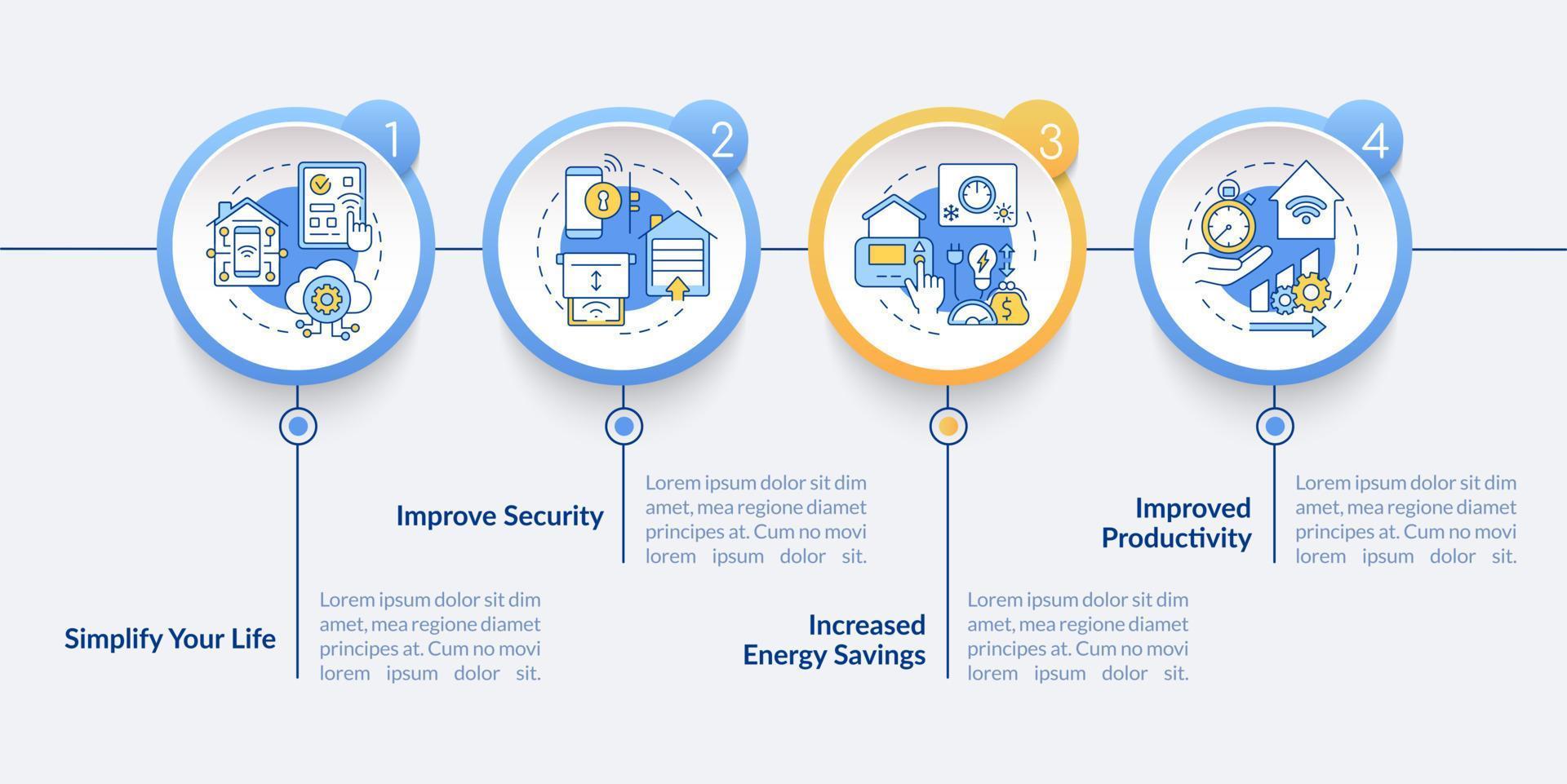Reasons for home automation circle infographic template. Data visualization with 4 steps. Process timeline info chart. Workflow layout with line icons. Lato-Bold, Regular fonts used Pro Vector