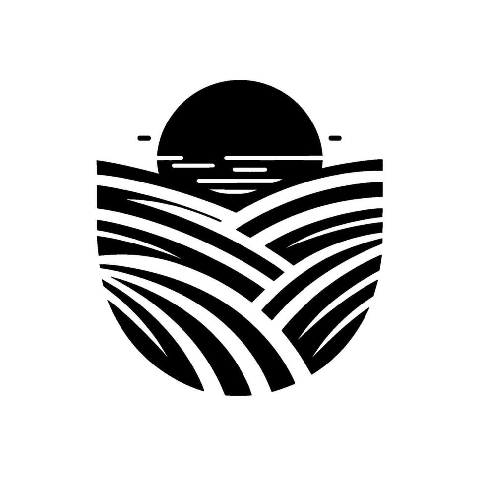 Minimalist black and white illustration of a sun setting over stylized rolling fields, creating a symmetrical, enclosed composition. Pro Vector