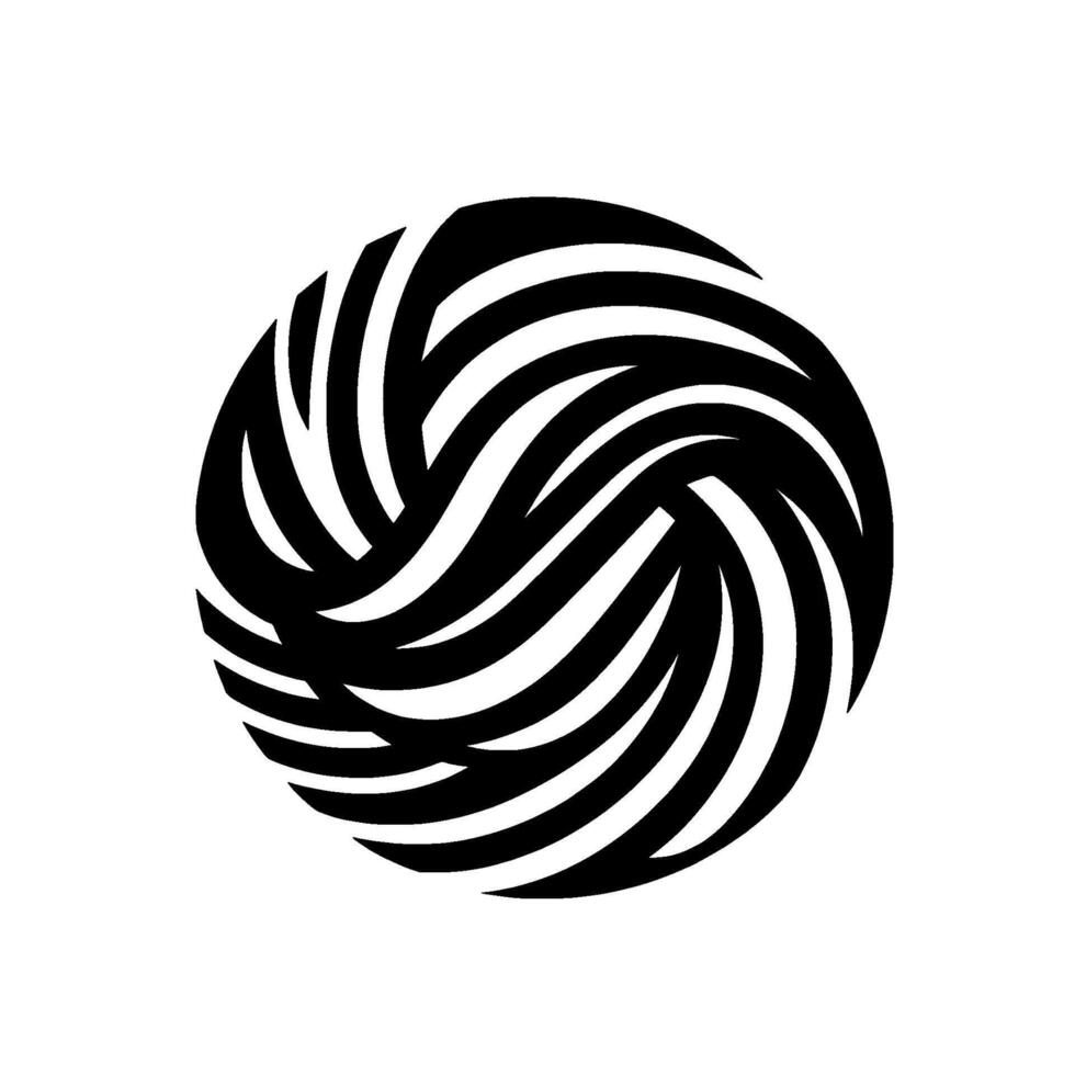 Black and white abstract of a circular, woven, swirling pattern of curved, parallel lines, set against a bright white background. vector