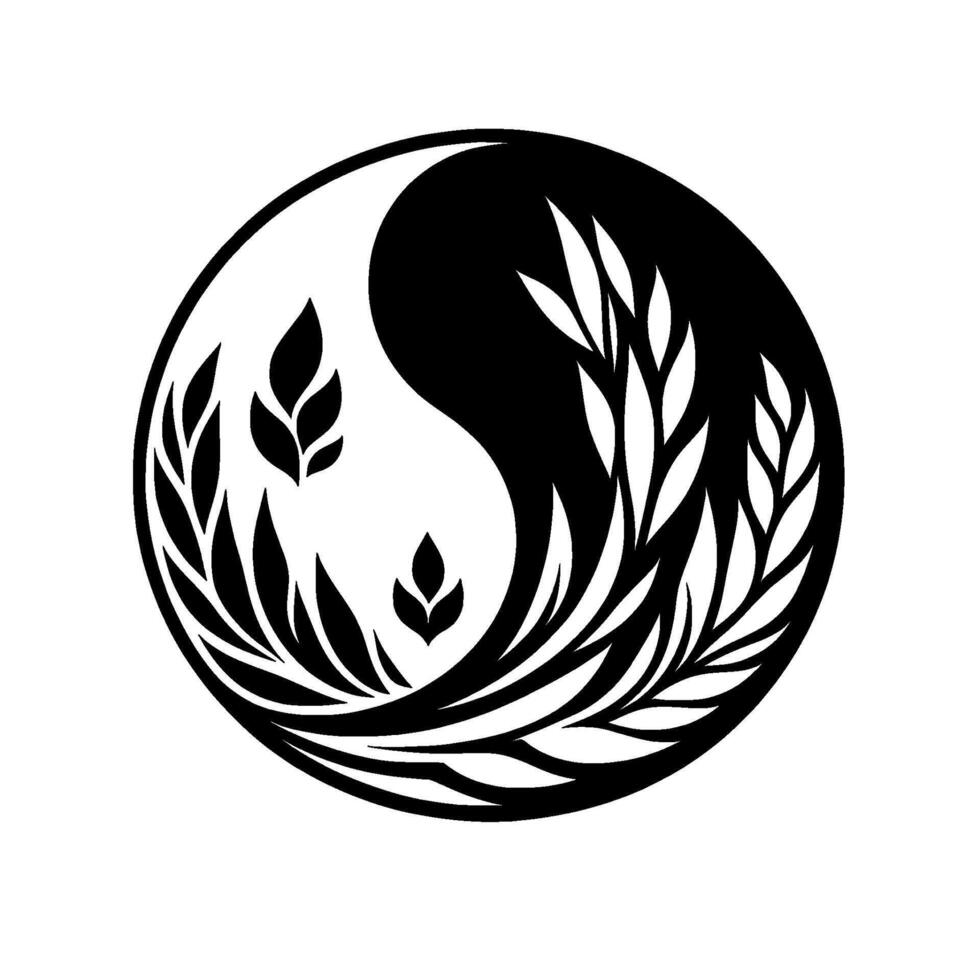 Yin and Yang Symbol with Botanical Elements, Black and White Artistic Representation of Balance, Harmony, and Nature in Circular Composition. Pro Vector