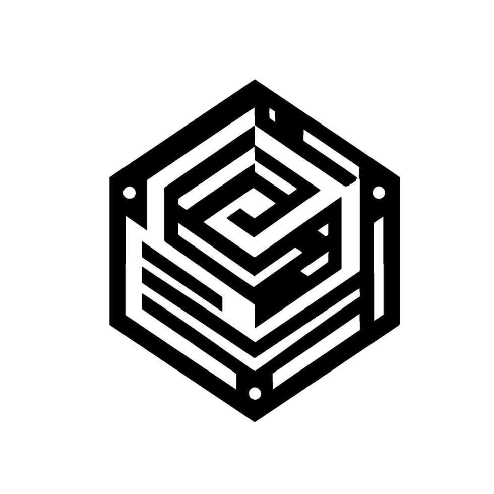 A stark black and white geometric illustration of a threedimensional hexagon containing an intricate mazelike pattern, evoking complexity and challenge. Pro Vector