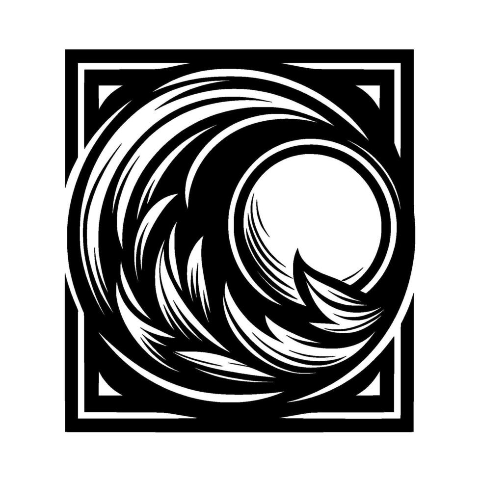 Intricate Black and White Swirl Within a Square Frame, Featuring Abstract LeafLike Elements Circling a Central Void. vector