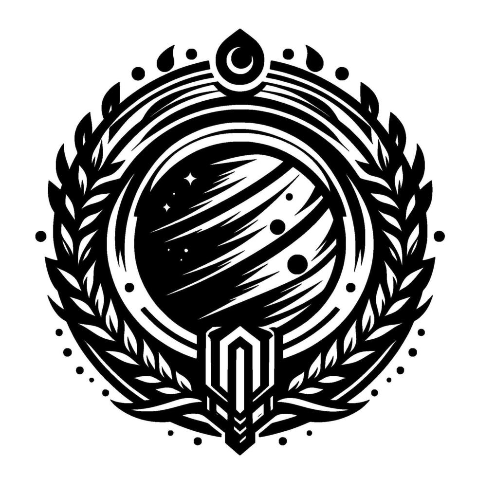 Abstract black and white emblem with a stylized planet surrounded by a laurel wreath, crescent, and geometric patterns, evoking a sense of cosmic unity. vector