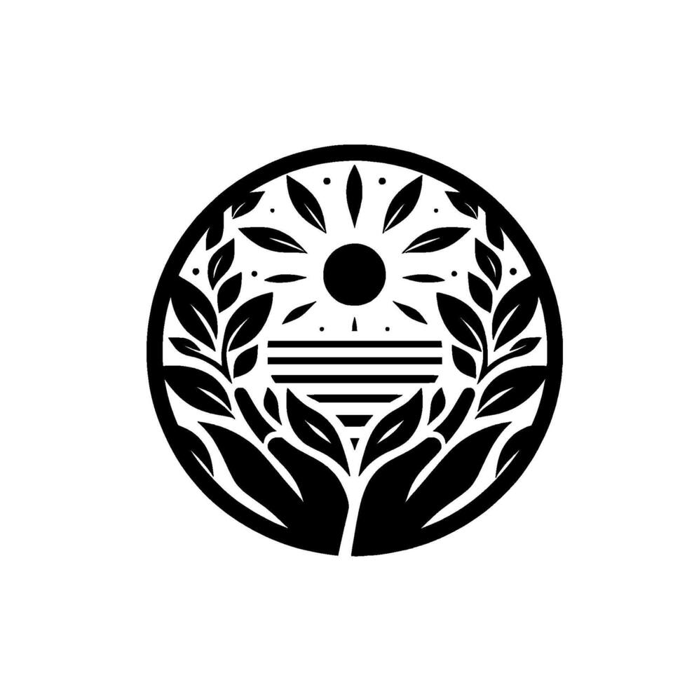 A serene, circular black and white illustration symbolizing unity, featuring hands cradling a sun setting behind layered lines and leaf embellishments. vector