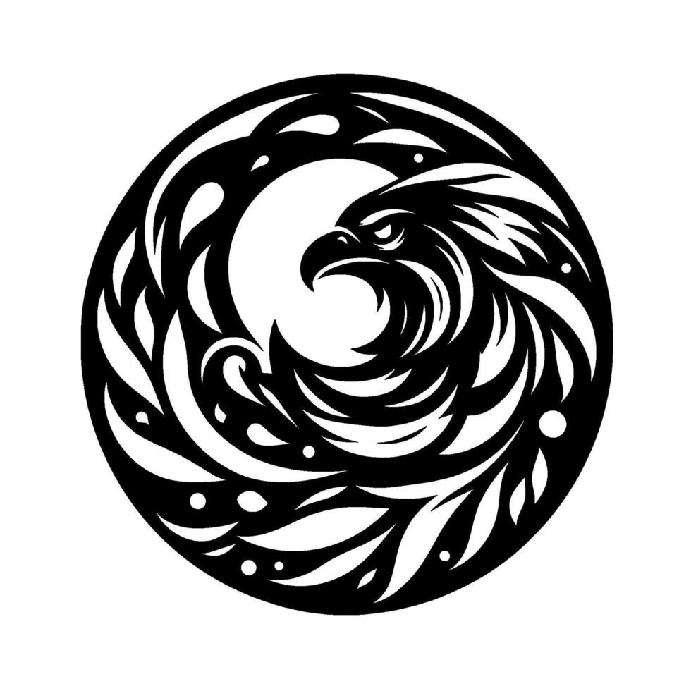 A stylized, monochromatic depiction of an eagle within a circular emblem, featuring intricate feather patterns and a fierce gaze. Pro Vector