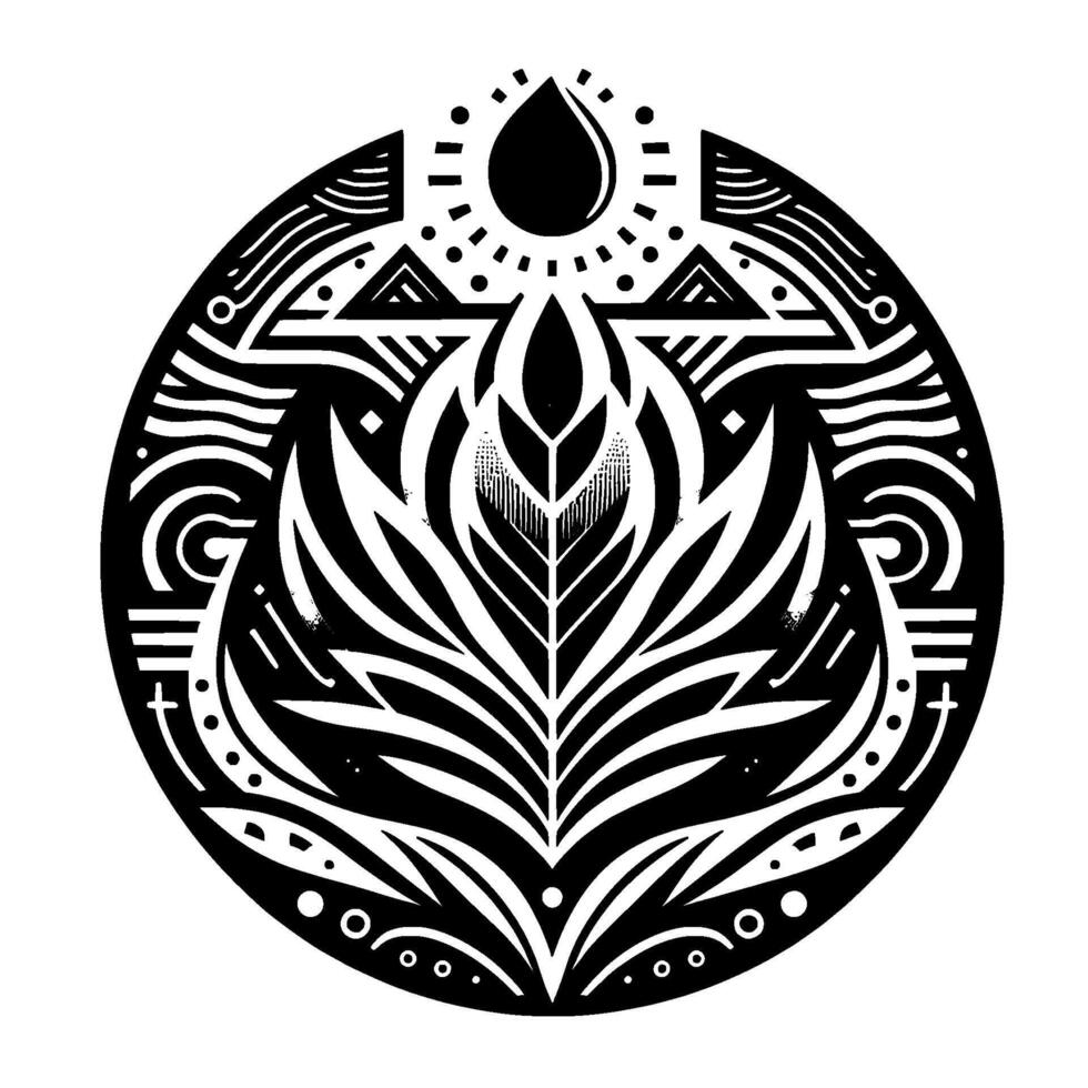 Intricate Black and White Geometric Mandala Featuring a Central Leaf Motif, Droplet, Sunburst, and Repeating Decorative Patterns in a Circular Composition. Pro Vector