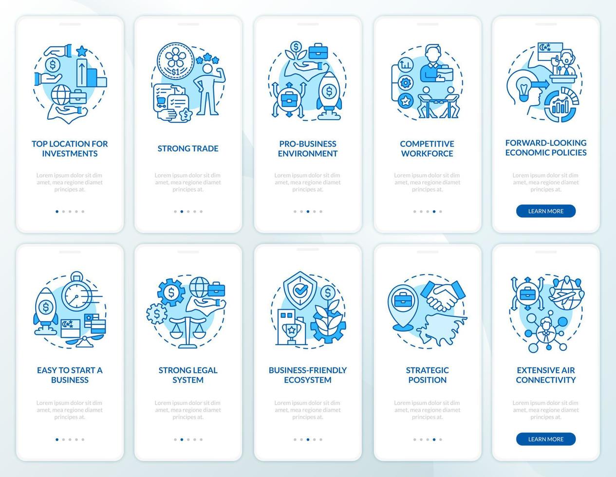 Business-friendly Asia blue onboarding mobile app screen set. Trading walkthrough 5 steps graphic instructions pages with linear concepts. UI, UX, GUI template. Myriad Pro-Bold, Regular fonts used Pro Vector