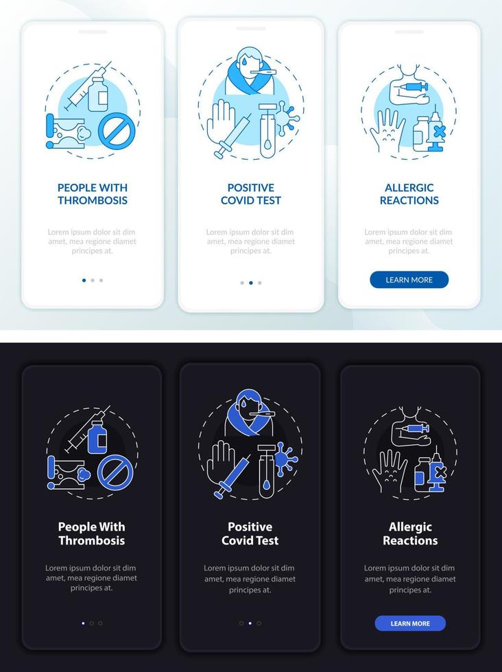 Vaccination limitations onboarding mobile app page screen. Covid test walkthrough 3 steps graphic instructions with concepts. UI, UX, GUI vector template with linear night and day mode illustrations Pro Vector