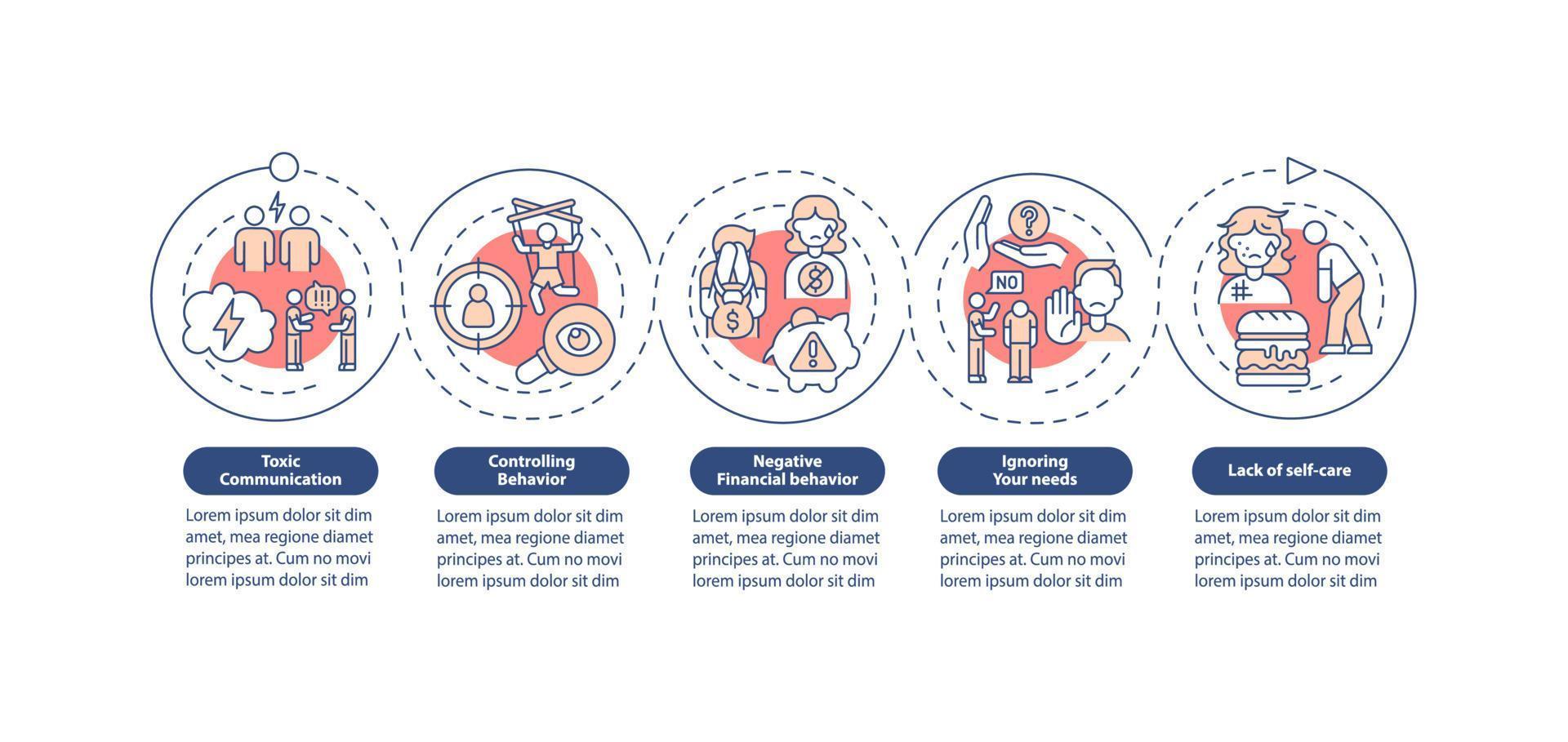 Relationship abuse vector infographic template. Toxic communication presentation outline design elements. Data visualization with 5 steps. Process timeline info chart. Workflow layout with line icons Pro Vector