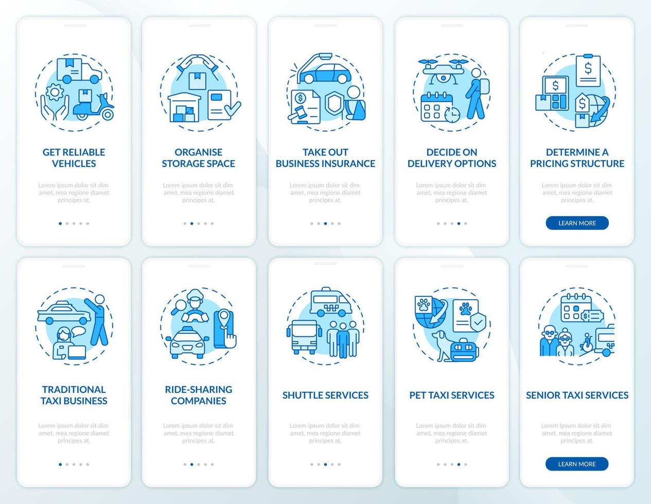 Start delivery business blue and white onboarding mobile app screen set. Postal walkthrough 5 steps graphic instructions pages with concepts. UI, UX, GUI template. Myriad Pro-Bold, Regular fonts used Pro Vector