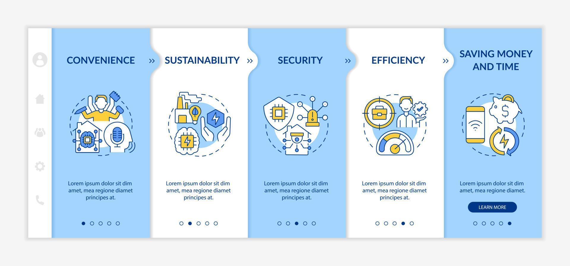 Smart technologies benefits blue and white onboarding template. Efficiency. Responsive mobile website with linear concept icons. Web page walkthrough 5 step screens. Lato-Bold, Regular fonts used Pro Vector