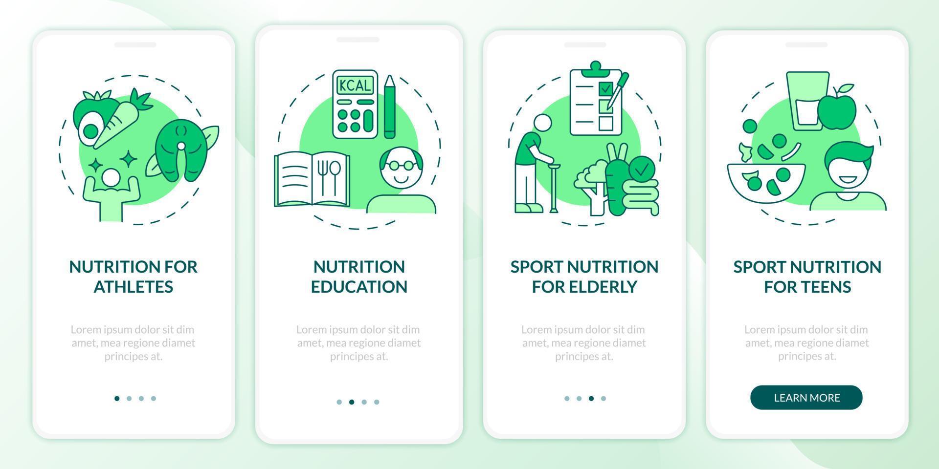 Eating for exercise and sports green onboarding mobile app screen. Food walkthrough 4 steps graphic instructions pages with linear concepts. UI, UX, GUI template. Myriad Pro-Bold, Regular fonts used Pro Vector