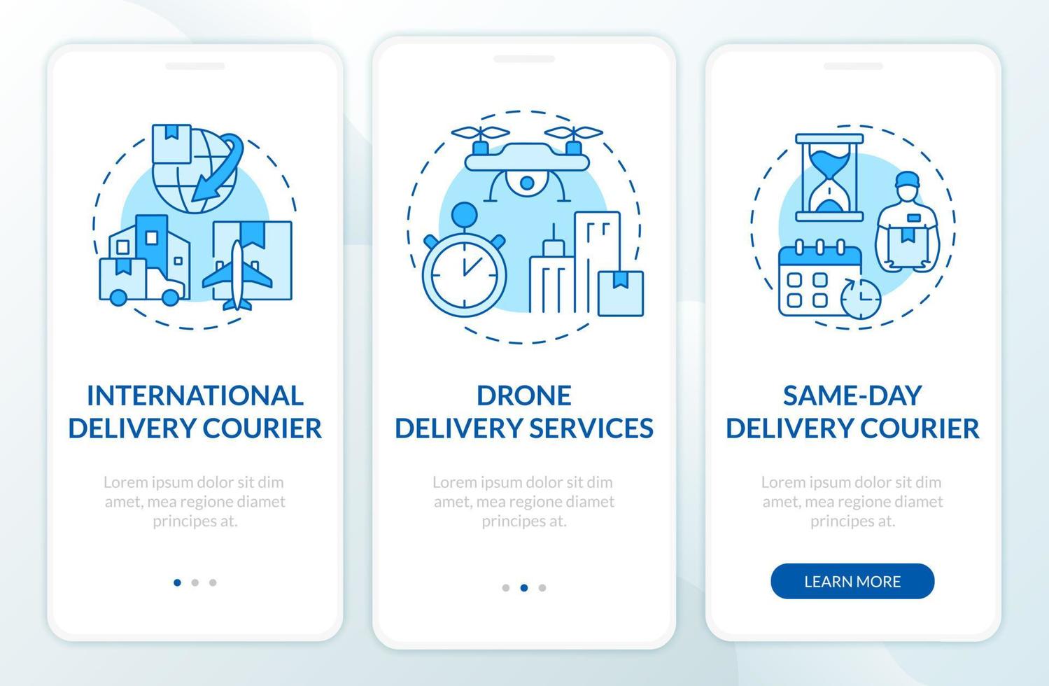 Courier delivery business blue and white onboarding mobile app screen. Post walkthrough 3 steps graphic instructions pages with concepts. UI, UX, GUI template. Myriad Pro-Bold, Regular fonts used Pro Vector