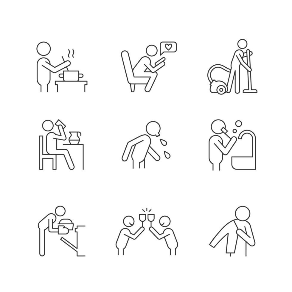 Day-to-day routine linear icons set. Activities of daily living. Habitual patterns of human behavior. Customizable thin line contour symbols. Isolated vector outline illustrations. Editable stroke Pro Vector