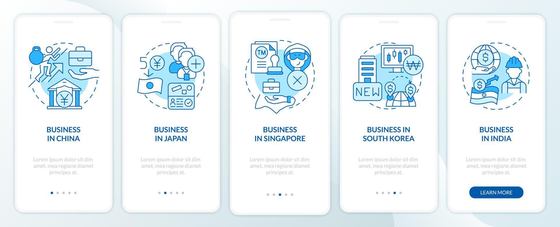 Best countries for doing business blue onboarding mobile app screen. Walkthrough 5 steps graphic instructions pages with linear concepts. UI, UX, GUI template. Myriad Pro-Bold, Regular fonts used Pro Vector