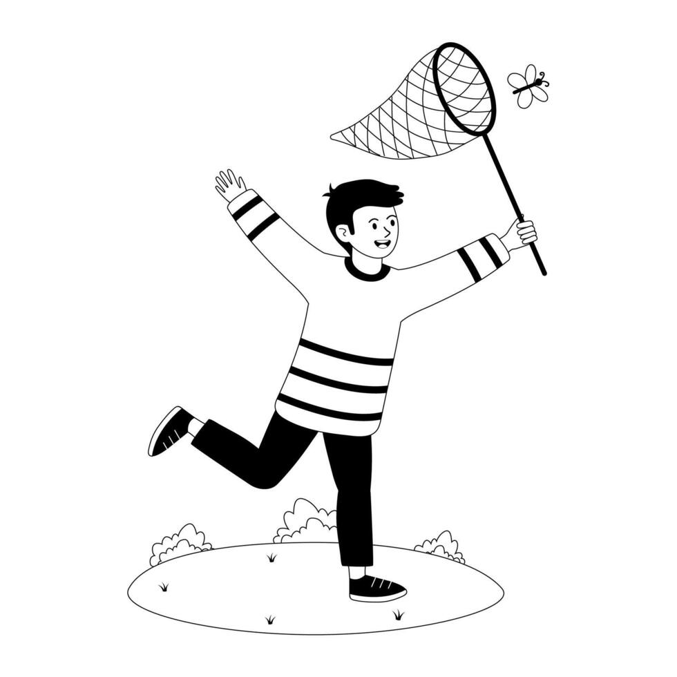 Child joyfully chasing a butterfly with a net in a grassy area during a sunny day Pro Vector