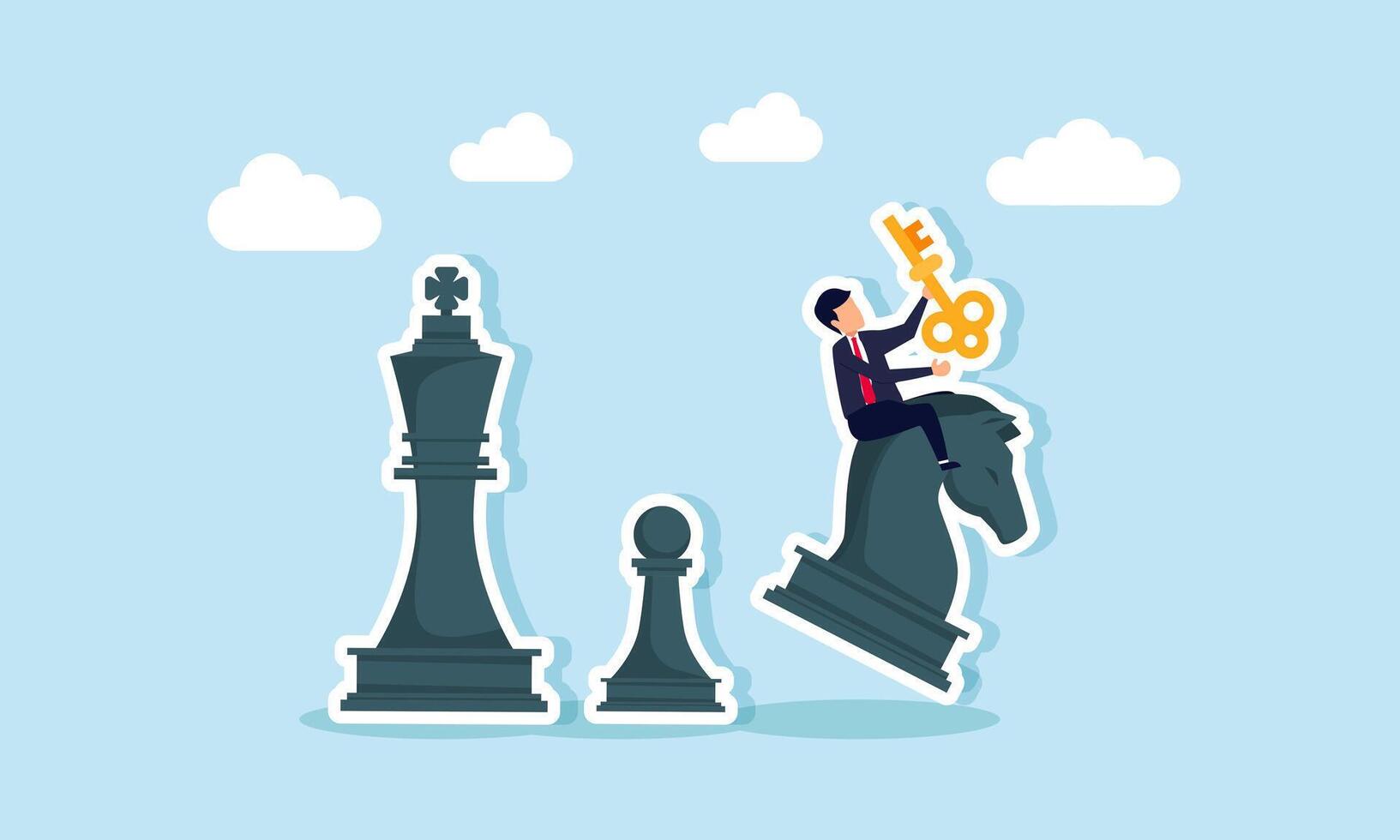 Businessman carries a key while riding a chess knight to move, illustration of movement in solving business problems Pro Vector