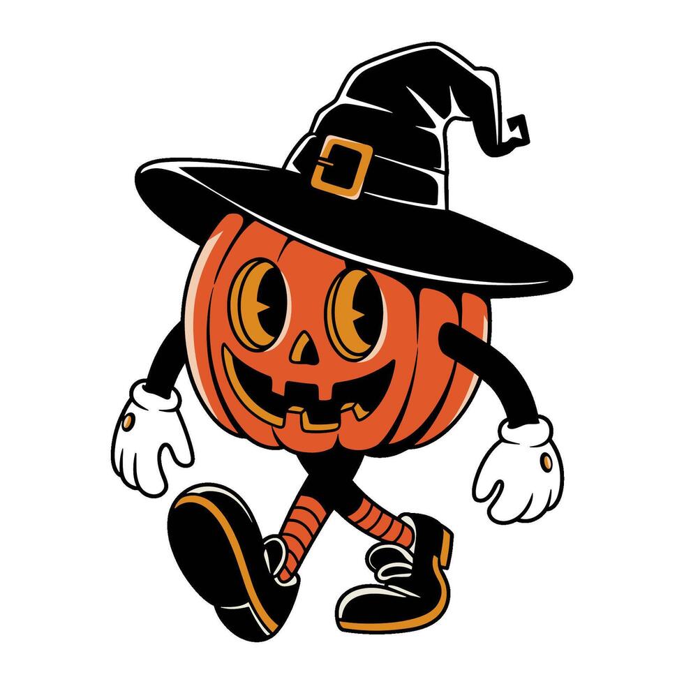 Retro pumpkin character walking in Halloween attire with playful expression and a witch's hat Pro Vector
