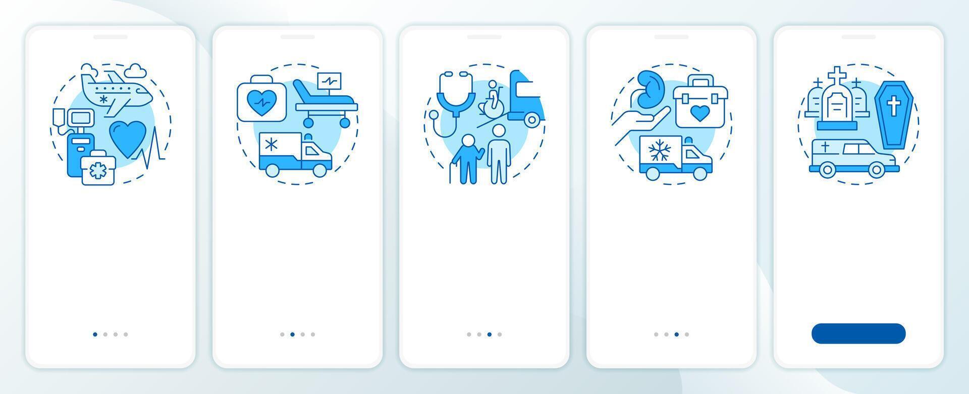 Medical transportation services blue onboarding mobile app screen. Walkthrough 5 steps editable graphic instructions with linear concepts. UI, UX, GUI template Pro Vector