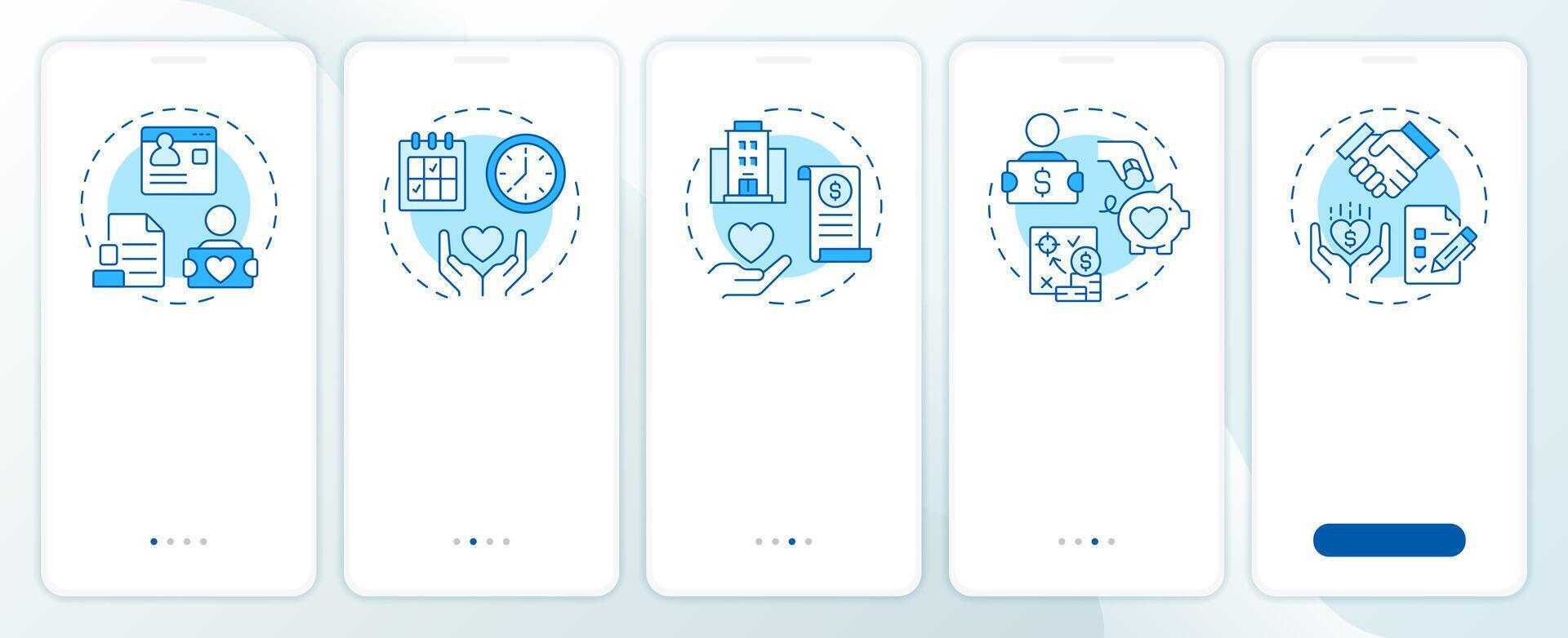 Volunteer activity tracking blue onboarding mobile app screen. Walkthrough 5 steps editable graphic instructions with linear concepts. UI, UX, GUI template Pro Vector