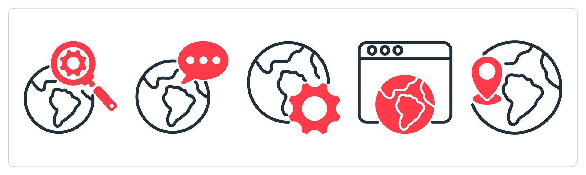 A set of 5 business icons as search engine, global communication, browser optimization Pro Vector