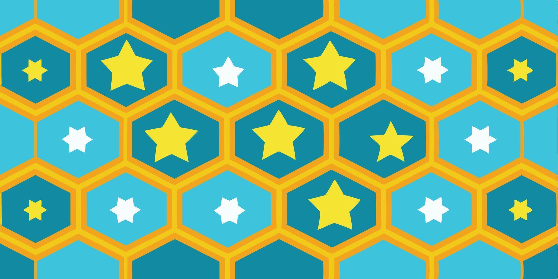 Geometric pattern, hexagonal grid, yellow outlines, teal background, star shapes, white stars, yellow stars, repeating pattern, symmetrical design Pro Vector