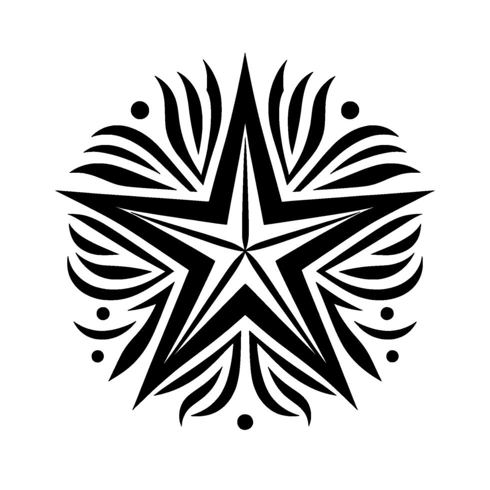 Intricate black and white a symmetric starburst with a fivepointed star at its core, accented by curved lines and dots, set against a plain white background. vector
