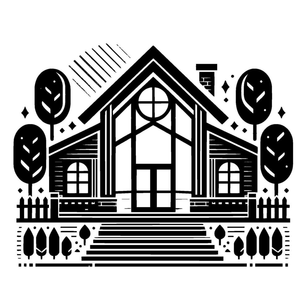 A minimalist monochrome illustration of a modern house with a gable roof, large windows, and symmetrical design, complemented by stylized trees and a welcoming pathway, all rendered in bold black line vector