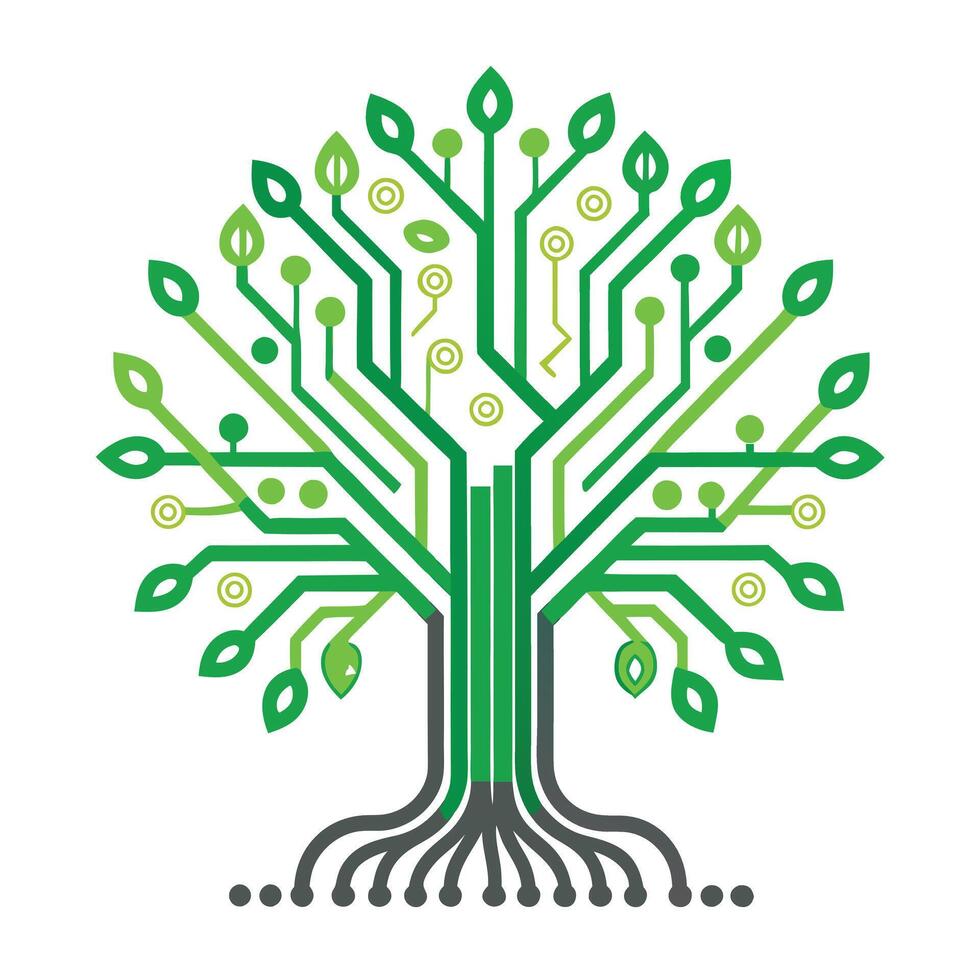 Stylized Tree Icon with Circuit Roots and Modern Design Elements Pro Vector