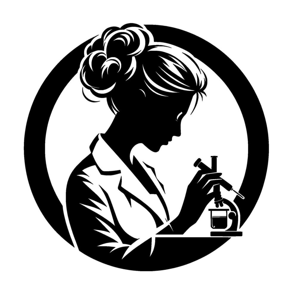 Silhouette of a female scientist in a lab coat, examining a specimen under a microscope, encapsulated in a black circular frame. vector