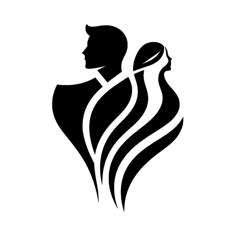 Silhouette of a man and woman in profile, intertwined by flowing lines, symbolizing connection and elegance in a monochromatic design. vector