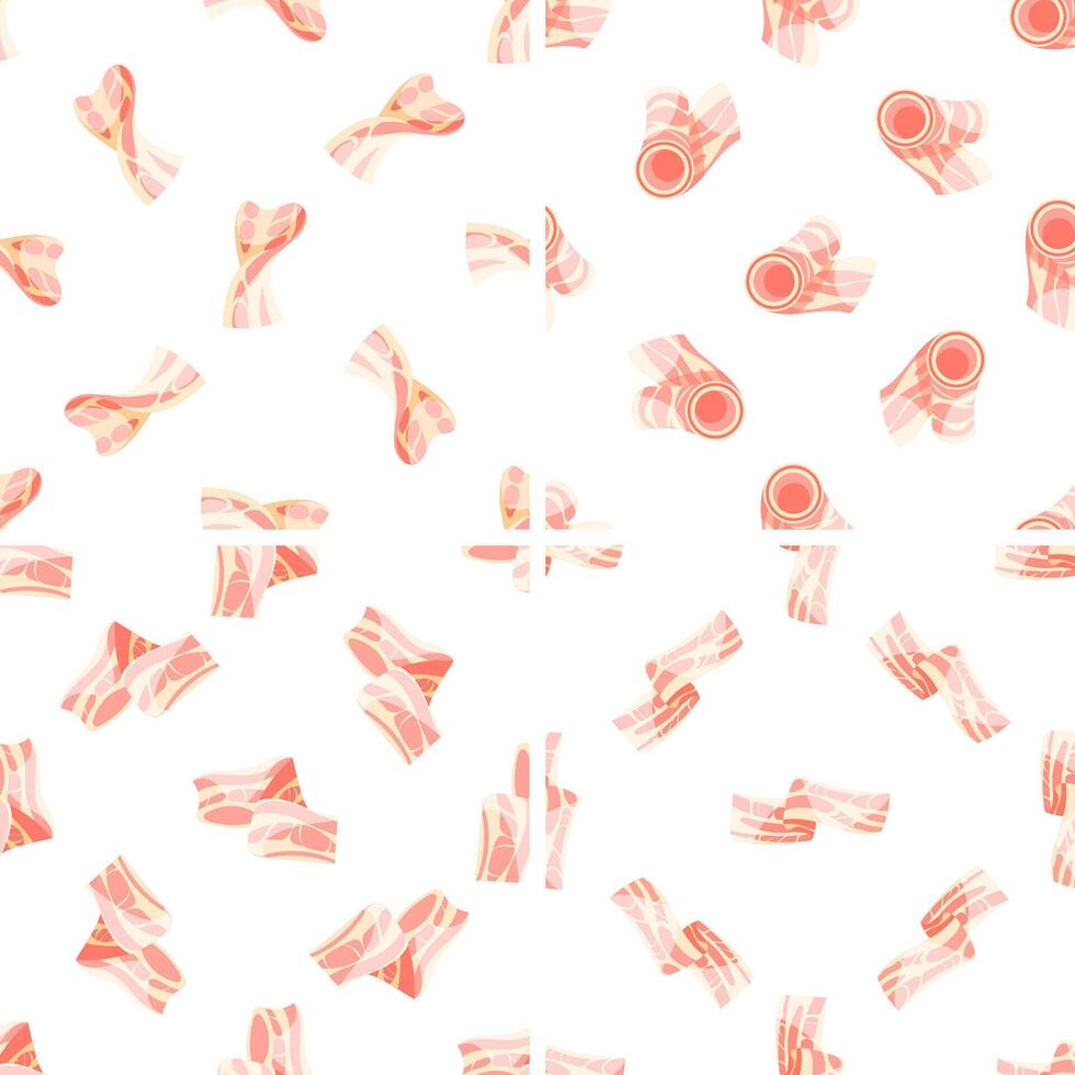 Seamless pattern with bacon slices rolling and unfolding on white background Pro Vector