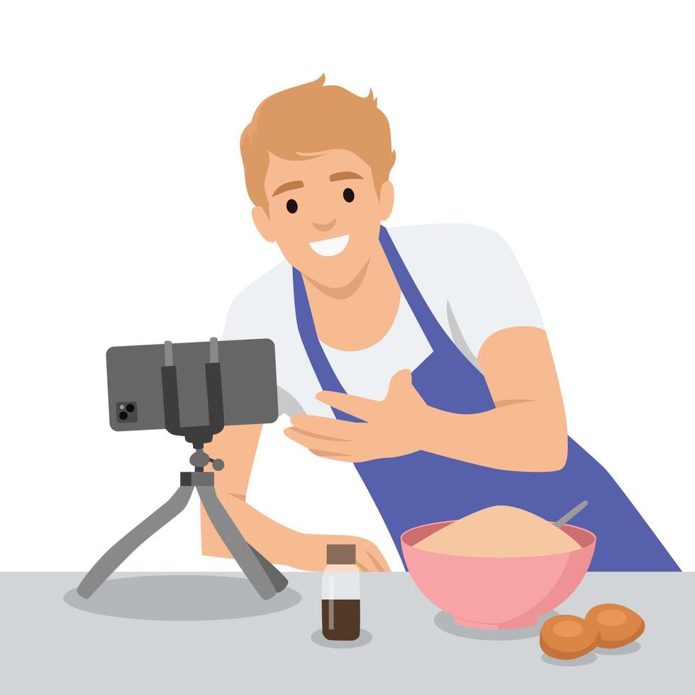 Man films a cooking tutorial, engaging with his audience through a smartphone on a tripod. Pro Vector